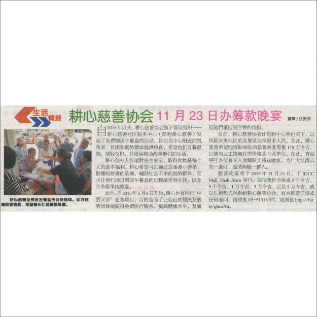 (新生活报)耕心慈善协会11月23日办筹款晚宴