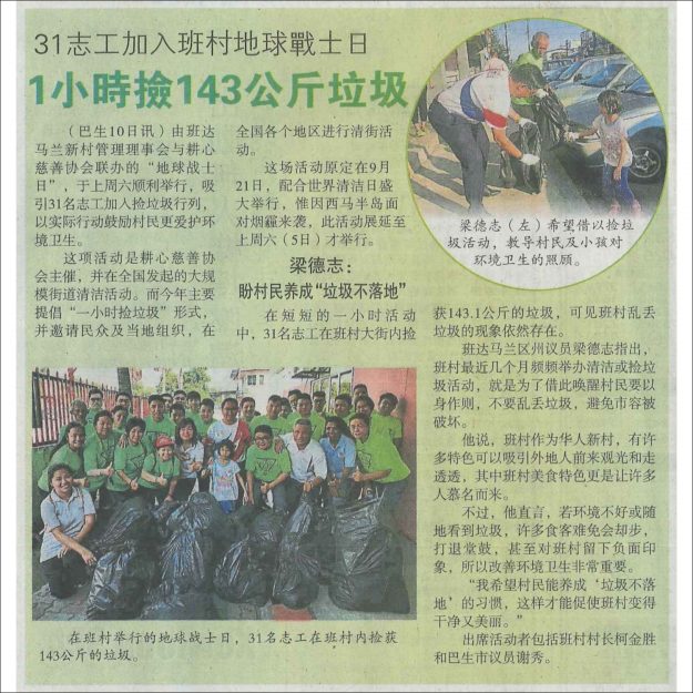 (星洲日报)31志工加入班村地球战士日,1小时捡143公斤垃圾