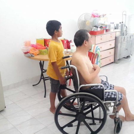 2015年2月的时候,晚上醒来要上厕所,结果左脚无力,整个人跌倒在地上。进医院后才发现到身体左边中风,没办法正常行动。太太几年前去世了,自己病发前是个小贩,养活照顾3个儿女。目前家人无法照顾,自己住在一间疗养院, 每一天要做针灸以及物理治疗,一个月的花费不少,先由亲戚来支付这笔费用。儿女们则由一位善心人士载送上下学,并煮中晚餐给他们吃。