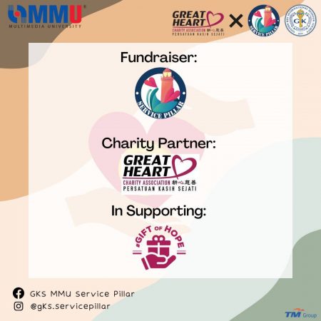 Service Pillar of Golden Key Society (GKS) Multimedia University Melaka Campus are currently collaborating with Great Heart Charity Association Malaysia to organise an online fundraiser. The aim of this online fundraiser is to raise funds to help six main targets which includes Dialysis Patients, Orphanage Homes, Old Folks, OKU/PWD, Indigenous and Underprivileged Families. Through this collaboration, Service Pillar of Golden Key Society Multimedia University hopes to cultivate the charitable act of giving in the hearts of each individual participating in our fundraising events.