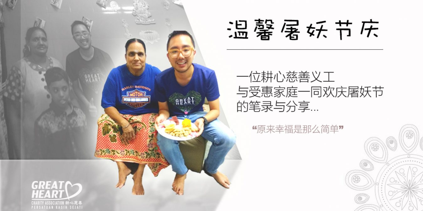 耕心慈善的义工 Joshua 日前受邀与耕心慈善携手共济慈善计划的两户受惠家庭 Ms.Parames and Ms.Lachemy共庆屠妖佳节,第一次庆祝屠妖节的他带着满满的感动的温情向我们说道: