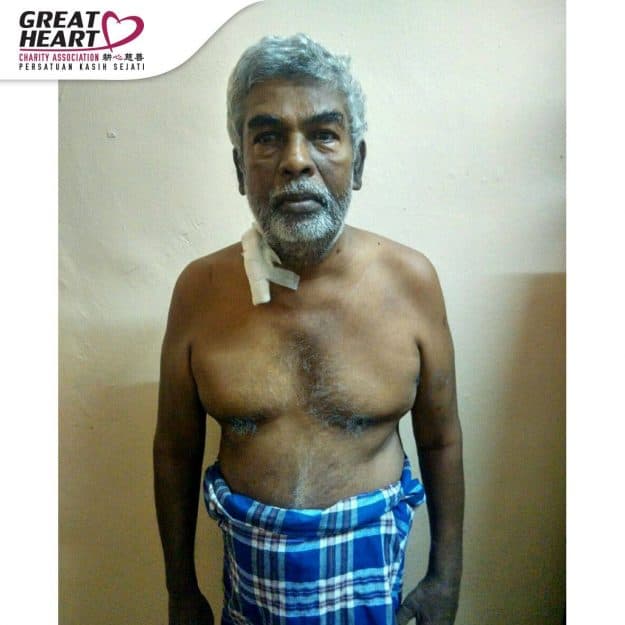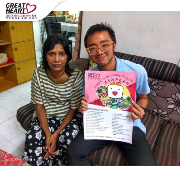 62-years-old Yellaiah was a rubber worker with 23 years of experience before he suffered from kidney failure and become unemployed. His utilized his EPF completely at the age of 55 for his house and kidney dialysis payment. Unfortunately, his right eye has become impaired since 1984, and his left eye even began to have blurred vision since 2 months ago and he is anxious about this. Great Heart Charity will be helping Yellaiah for six months in the dialysis aid of Rm720. However, they still needed more support from the public as their dialysis expense of Rm2000 above monthly has suffocating them tremendously.