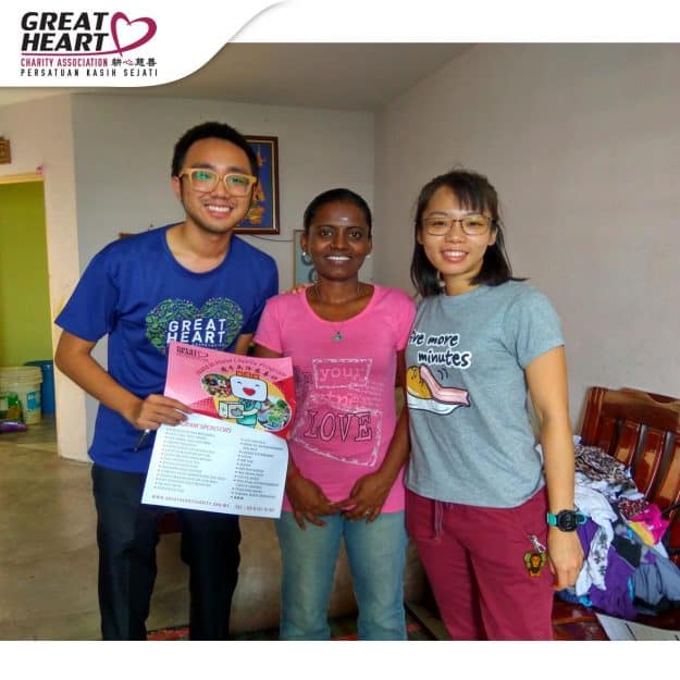 Tan Hock Chuan used to be working as a welder in iron factory with his Rm2000 salary. However, when he gets older, he started to lose his strength and then unable to work there anymore. He has been unemployed for few months due to his weak physical condition. Fortunately in March, he get a new job as a security guard in Econmart with Rm1000 salary. Great Heart Charity has helped Tan’s family in her rental debt (Rm1250) and groceries for them in March so their kids aren’t starving, and Rm250 rental support for April and May 2017 As a token of appreciation, Mei Fong helped us to clean the Great Heart community centre. However, they still needed at least Rm250 rental support every month because their living expense is huge with 3 kids.