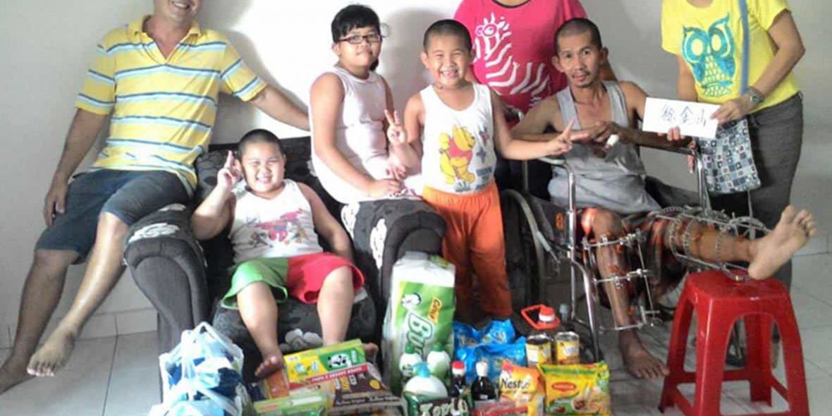 徐金山先生在帮顾客换罗里轮胎时,过程因过度气压,导致轮胎当场爆炸。他的左手四只手指皆断骨,四肢受伤严重,在巴生政府医院动了两次手术,需要在家进行康复休养。家里上有年迈的父母需要赡养, 下有四名年纪尚小的儿女需要抚育,开销极大,突如其来的灾难使这个小康之家陷入痛苦与困窘之中。