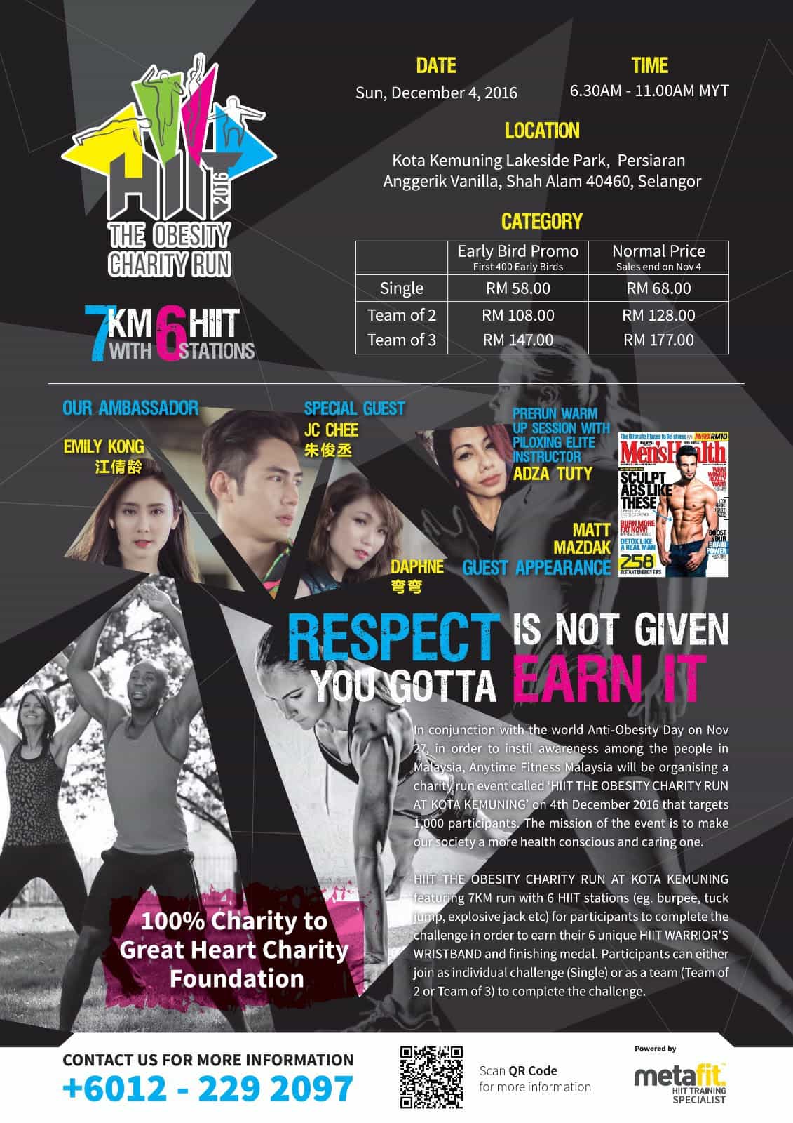 HIIT THE OBESITY CHARITY RUN AT KOTA KEMUNING featuring 7KM run with 6 HIIT stations (eg. burpee, tuck jump, explosive jack etc) for participants to complete the challenge in order to earn their 6 unique HIIT WARRIOR’S WRISTBAND and finishing medal. Participants can either join as individual challenge (Single) or as a team (Team of 2 or Team of 3) to complete the challenge.